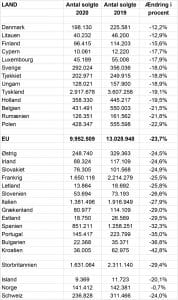 Generelt klarede bilsalget i de skandinaviske lande sig nogenlunde gennem corona-året 2020 med en nedgang på mindre end 20 procent i alle landene. Norge, der ikke er med i EU, er nærmest helt uden for nummer. Nordmændene kan blot notere en stort set ikke-målbar nedgang på 0,7 procent.