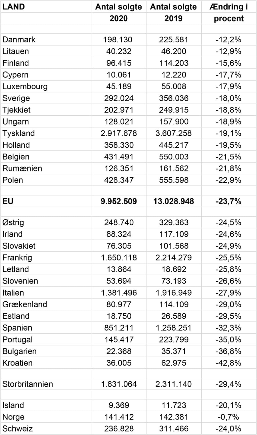 Set med de rød-hvide briller kan vi dog glæde os over, at Danmark er det EU-land, hvor den procentvise nedgang fra 2019 til 2020 var mindst. “Kun” 12,2 procent færre solgte, i styktal en nedgang på 27.451 til 198.130. Danmark fortsatte dermed de “gode” takter fra den hæslige april 2020. Også i den måned var vi det mindst hårdt ramte EU-land med en nedgang på 37 procent sammenlignet med april 2019.
