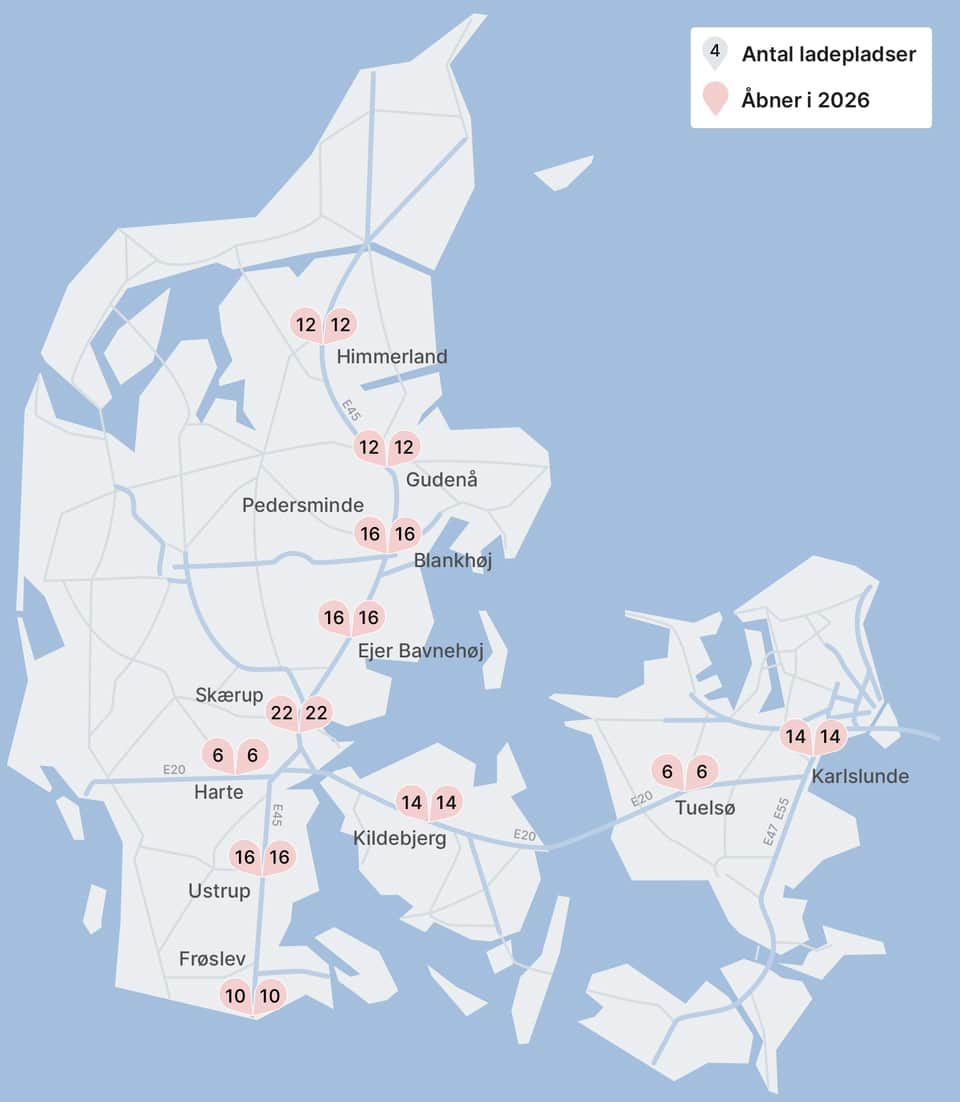 Når 2026 skydes ind den 1. januar, åbner Vejdirektoratet 22 nye ladeparker på rastepladserne langs landets største og mest befærdede motorveje. De nye ladeparker betyder, at elbilister kan køre gennem Danmark uden at forlade motorvejen, når de skal lade elbilen op.