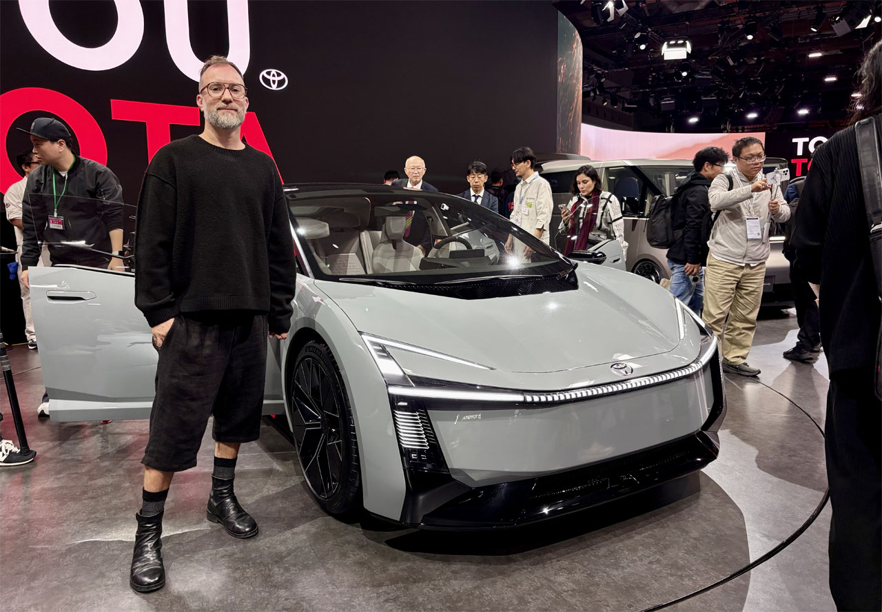 Den nye konceptudgave af Corolla står knivskarpt som midtpunkt på hovedscenen ved Japan Mobility Show. Her er bilen netop blevet afsløret af administrerende direktør for Toyota, Koji Sato, for øjnene af hundredvis af journalister og fotografer fra hele verden. En stor oplevelse for den danske bildesigner.