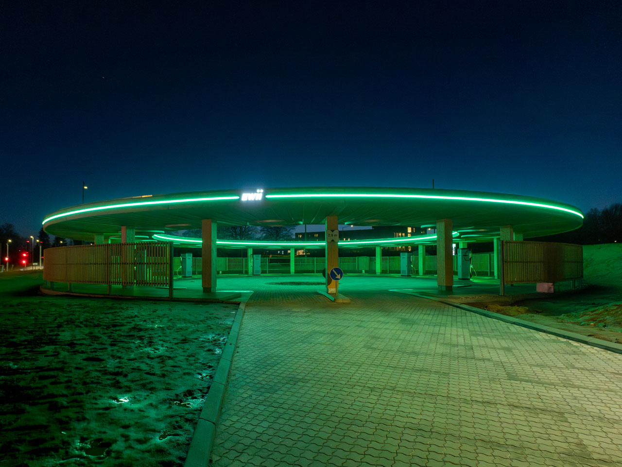 De 12 ladepladser er overdækkede af et cirkelformet sedumsdækket tag, som både passer ind i omgivelserne og forsinker afledning af regnvand.