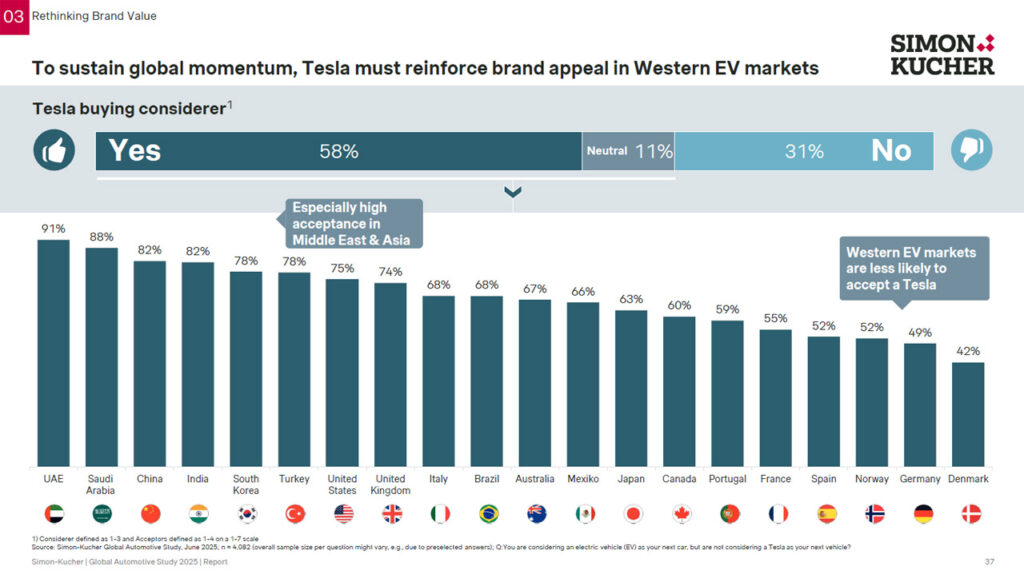 Det globale gennemsnit placerer sig midt imellem: 58 procent vil gerne overveje en Tesla, 11 procent er neutrale, mens 31 procent siger nej tak.
