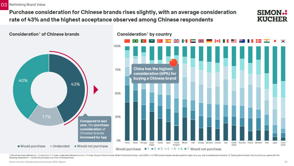 Globalt indgår kinesiske biler nu i overvejelserne om en ny bil blandt 43 procent af bilkøbere. En lille stigning sammenlignet med sidste år, hvor 39 procent overvejede en bil fra Kina.