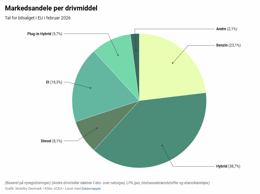 Lægger man markedsandelene for elbiler (18,3 procent) sammen med ladehybrider (9,7 procent), sælges der nu 28 procent elektrificerede biler mod 23,1 procent benzinbiler og 8,1 procent dieselbiler i EU.