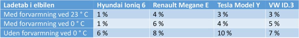 Men i koldt vejr – og især hvis bilen ikke forvarmer batteriet – kan tabene hurtigt stige til 6-10 procent. Det skyldes, at en del af strømmen først går til at opvarme batteriet, før opladningen begynder.