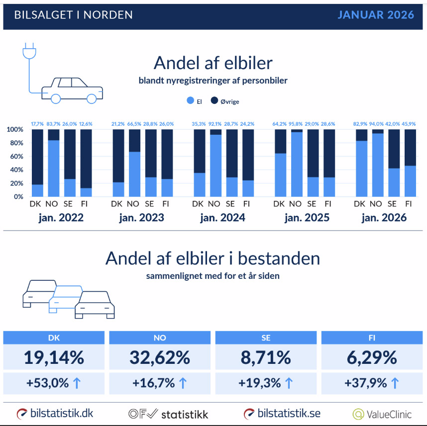 Elbilerne lagde også hårdt ud i 2026. Herhjemme udgjorde elbiler 82,9 procent af det samlede antal nyregistreringer i januar. Det er en markant stigning på 18,7 procentpoint fra andelen i januar 2025 og den hidtil højeste andel af elbiler i det danske bilsalg i en enkelt måned.