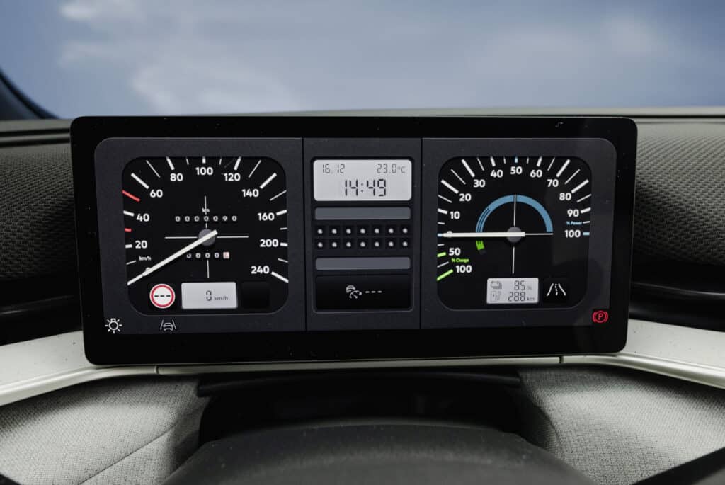 Her er fortsat to skærme. Den mindste bag rattet viser blandt andet hastighed og batteristatus. Med tryk på en enkelt knap skifter skærmbilledet til en tro kopi af speedometer og omdrejningstæller i de første Polo og Golf. Det er rendyrket firser-nostalgi, så her har VW måske skævet til Renault, der har stor succes med deres retro-moderne elbiler 4 og 5.