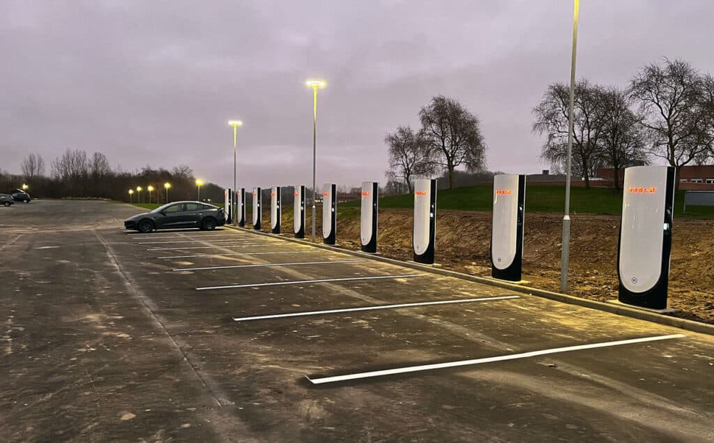 Tesla er stadig billigst på lynladning når man tager udgangspunkt i kontantprisen. Her den nye Supercharger-station i Viby syd for Aarhus.