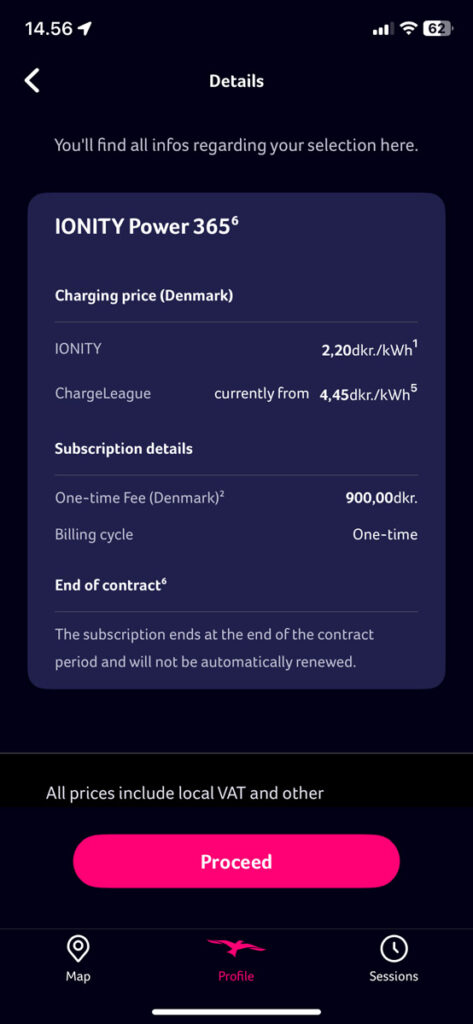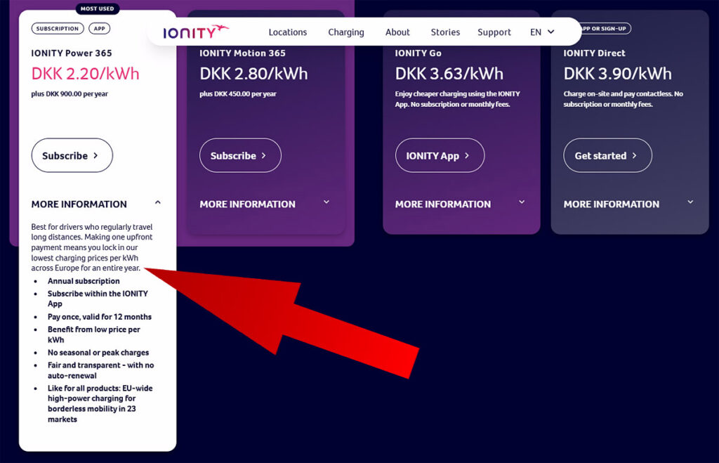 Den høje pris kom bag på os. For i aftalen med Ionity står klart og tydeligt om det såkaldte Ionity Power 365 abonnement, at “ved at lave én forudbetaling, låser du dig fast på vores laveste ladepriser pr. kWh på tværs af Europa i et helt år.”
