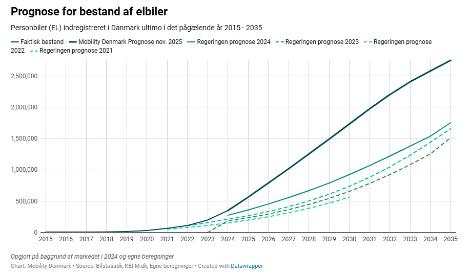 Første milepæl med én million elbiler nås altså i 2027. Allerede tre år senere, i 2030, vurderer prognosen, at der vil være 1,7 millioner elbiler i Danmark. Det er mere end halvdelen af den samlede bilbestand i Danmark.