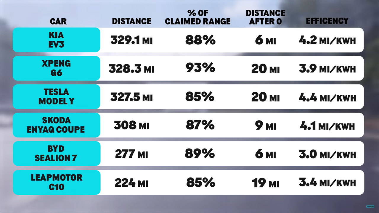 Hele tre biler fortsatte mere end 30 kilometer før de gik i sort og stoppede. Tesla Model Y og Xpeng G6 klarede begge 32,1 km før de gav op. Kia EV3 kom lige efter med 30,5 km.