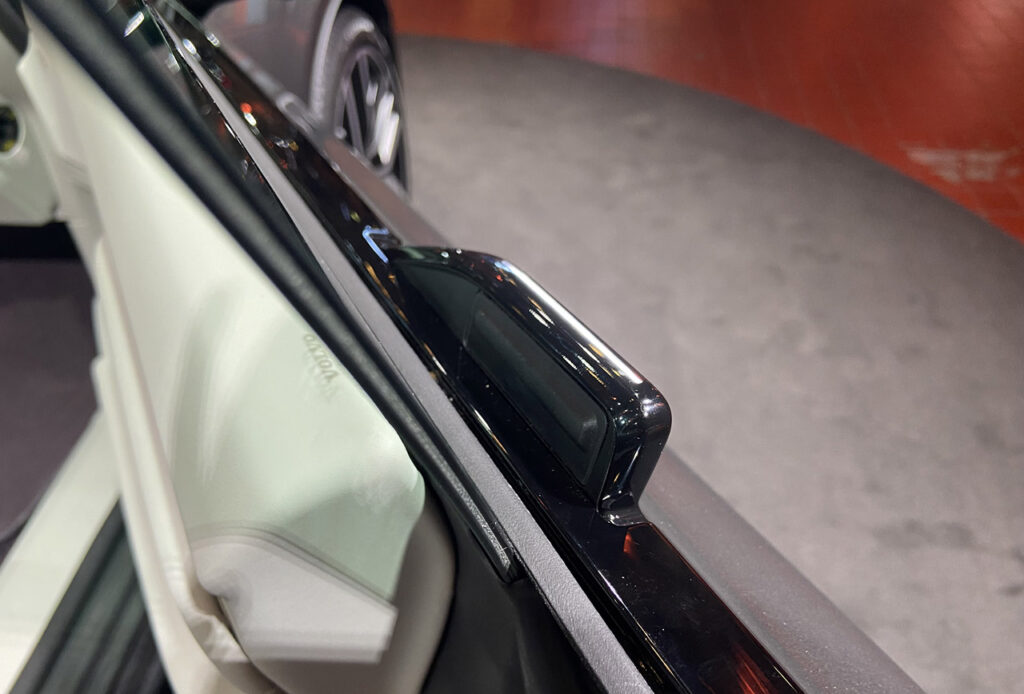 I stedet har Volvos designere placeret små ‘vinger’ oppe på dørkanten. Vingen bevæger sig ikke, men et tryk på den elektriske kontakt på bagsiden af vingen åbner døren.