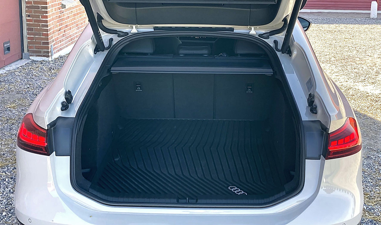 Sportback-bagagerummet er på 500 gennemsnitlige liter, hvilket også overrasker – ikke positivt – når man tager bilens længde i betragtning. Sportback er dog det samme som stor bagklap, så det er nemt at komme til. Under fronthjelmen har A6’eren et rum på 27 liter til f.eks. ladekabler. Dét kan vi godt lide.