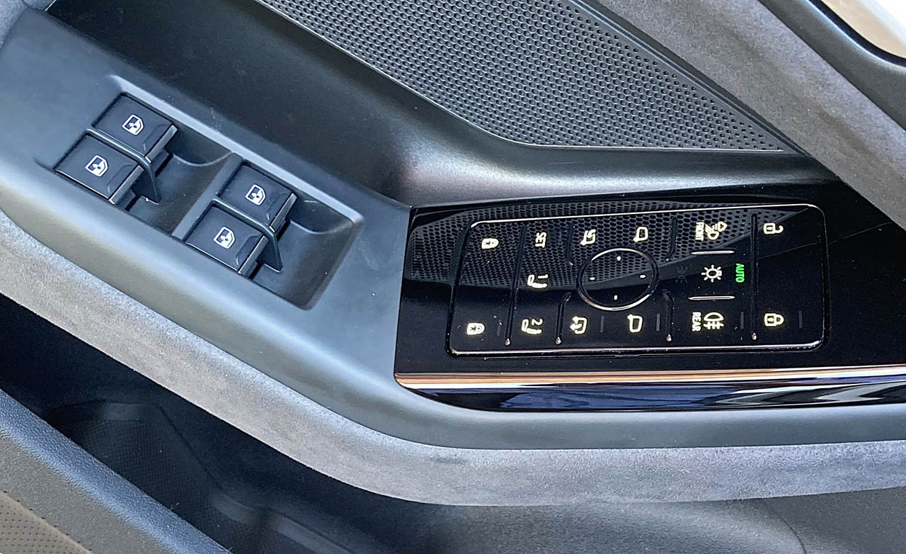 Størstedelen af de knapper, der er, er af haptisk feedback-typen, og de fungerer altså ikke optimalt som lige ud ad landevejen-knapper, der reagerer med et mærkbart klik. På rattet sidder en samling haptisk feedback-knapper, og ikke mindst på førerens dørpanel er der gang i festen med ikke færre end 15 styk. Til lyset, til justering af sidespejle, låsning, memory til sædeindstilling samt børnelås på bagdøre.