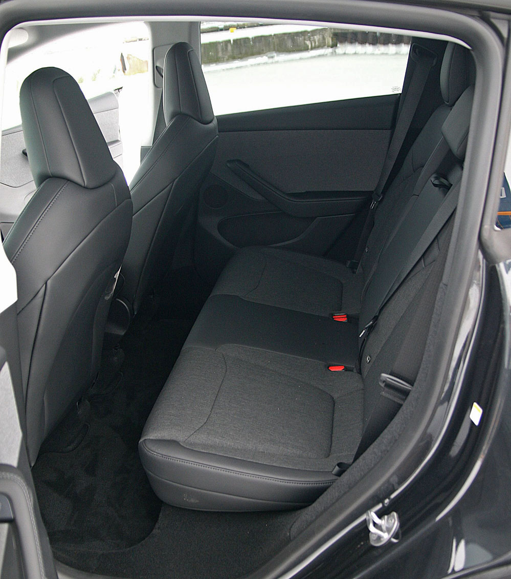 Basisudstyret omfatter ikke varme i bagsædernes yderste pladser, ligesom den heller ikke har samme lille skærm som i Premium og Performance. Men den gode plads på bagsædet er lige så rigelig, og bagagerummet er stort. Hvor stort kan ikke angives præcist, da Tesla opgør rummål på anden vis, men stort – dét er det.