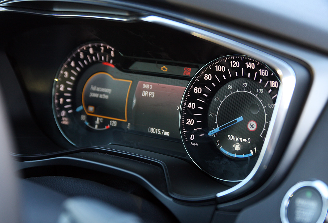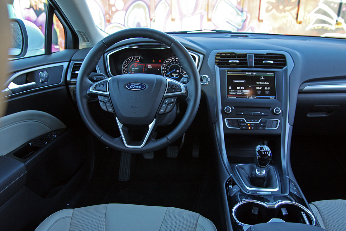 Selv om Ford Mondeo kører videre på forgængerens platform, er især interiøret gennemrenoveret. Der er ryddet op i betjeningen med en stor trykfølsom skærm i midterkonsollen, instrumenterne er fuldelektroniske med Titanium-udstyr, og finishen har fået et mærkbart løft. Ford er endnu ikke på Passat-niveau, men Mondeo-kabinen er afgjort blevet mere lækker. Desværre viser de elektroniske instrumenter så mange informationer, at det går ud over læsbarheden – og blåt instrumentlys gør ikke læsbarheden bedre i mørke.