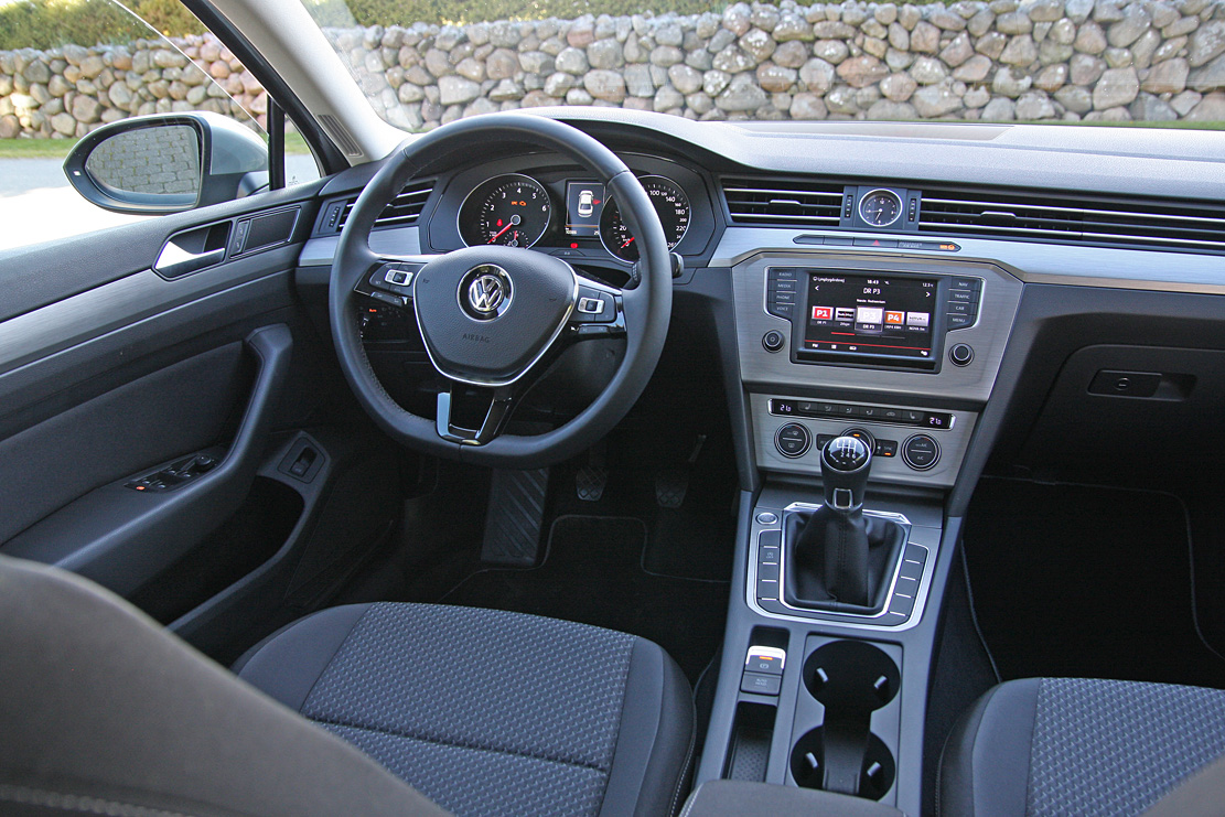 Hvis det ikke var for VW-koncernens aktuelle forkærlighed for lige linjer og stramme streger, ville det næsten være umuligt at se forskel på førerpladsen på den nye og foregående Passat. Det kan virke idéforladt, men du føler dig straks hjemme bag rattet og lærer hurtigt at sætte pris på en betjening så streng, logisk og velfungerende, som kun en tysk diplomingeniør udtænker den. Til overflod er her overdådig plads og en ergonomi, som enhver fysioterapeut vil bifalde. Passat er med andre ord en dybt saglig og professionel arbejdsplads for firmabilisten, der kører mange kilometer.
