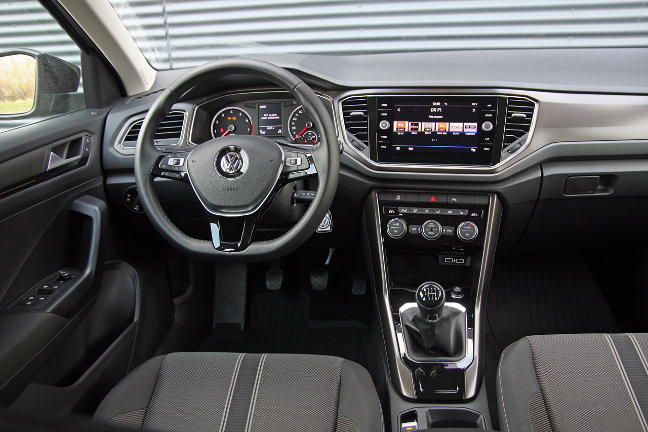 Hvis man ser bort fra VWs væg-til-væg brug af stenhård plastic, er førerpladsen i T-Roc særdeles velfungerende. Golf-ejere vil straks føle sig hjemme, finde greb og kontakter i mørke og glæde sig over et perfekt forhold mellem rat, pedaler og et sæde, der støtter alle de rigtige steder. Du sidder bare højere end i Golf, med de fordele det giver i form af godt overblik og komfortabel ind- og udstigning. Den store infotainment-skærm i midterkonsollen er udført i glas, hvilket er det eneste indslag af luksus i den rustikke T-Roc kabine. Med mindre du ofrer 6.000 kroner på den ret spektakulære digitale instrumentering.