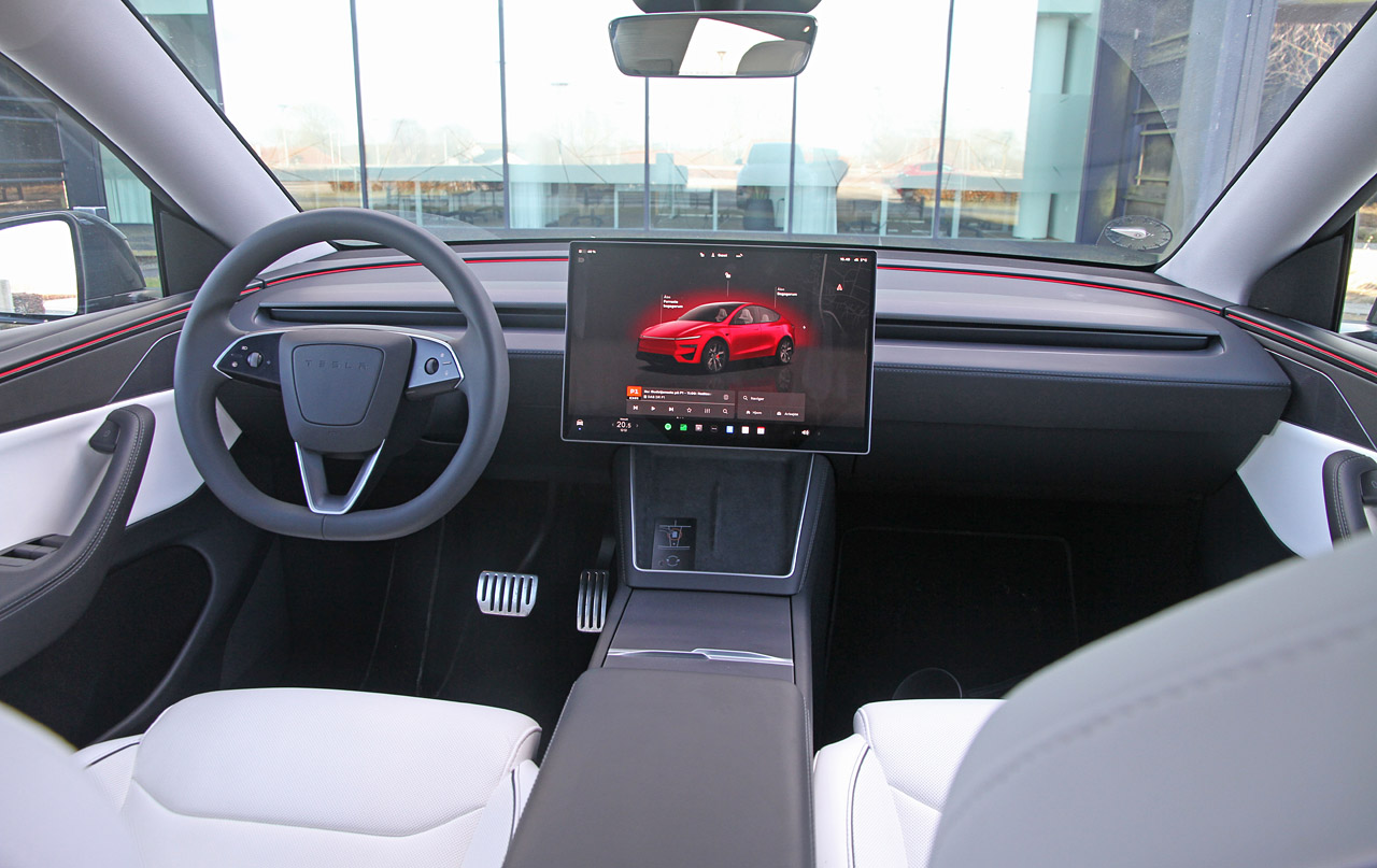 Et rat, én skærm og to pedaler. Sådan er førerpladsen i Model Y stadig indrettet.