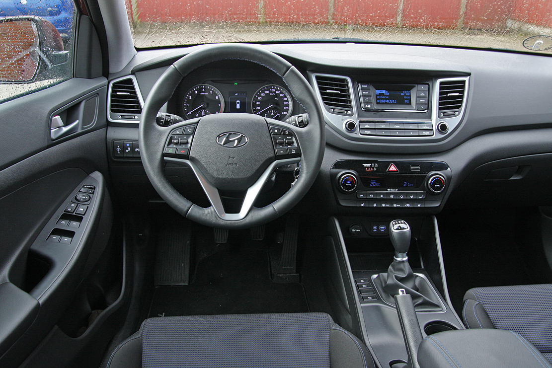 Høj og med et udsyn som kommandobroen fra et skib – nøjagtig som man forventer det af en SUV. Betjeningen er klassisk asiatisk: No bullshit, bare klokkeklare instrumenter og langt flere knapper end vi er vant til. Selv med Trend-udstyr springer Hyundai nemlig den moderne trykfølsomme skærm over. Til gengæld klikker knapperne med samme præcision som i en Lexus, og har du først lært deres placering, kan Tucson betjenes uden at tage øjnene fra vejen. Der er god plads bag rattet, og de faste forsæder med eljusterbar lændestøtte er komfortable på langturen.