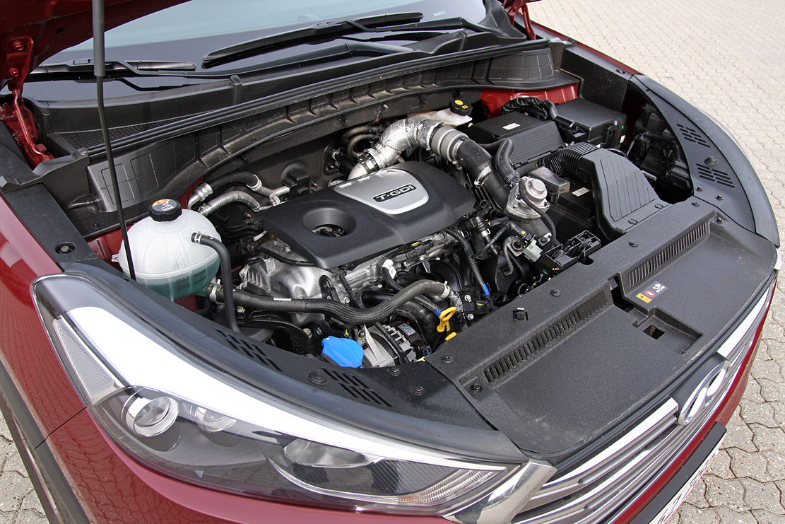 Igen overrasker Hyundai Tucson positivt. Vi kender den firecylindrede 1,6 liters motor som lidt brystsvag basismotor i i30 og i40, men her med turbo og 177 heste fremstår den stærk, kultiveret og omdrejningsvillig. Under acceleration knurrer motoren veloplagt for så at falde helt til ro oppe i fart, og den trækker rent helt nede fra godt 1.000 omdrejninger. At koreanerne har fået styr på mekanikken, understreges af et kort og præcist gearskifte, der i klassen kun findes bedre i Mazda CX-5. T-GDI motoren har underligt nok ikke start-stop automatik og det forklarer til dels normforbruget på 13,7 km/l. Det er til den tørstige side – til gengæld nåede vi tæt på med et testforbrug på 12,6 km/l.